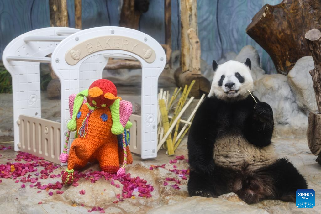 Giant panda Gonggong takes food at the Hainan Tropical Wildlife Park and Botanical Garden in Haikou, south China's Hainan Province, Nov. 25, 2023. Giant pandas Gonggong and Shunshun have lived in Hainan for five years since they made their public debut at the Hainan Tropical Wildlife Park and Botanical Garden in 2018. A celebration ceremony was held here on Saturday, attracting lots of visitors. (Xinhua/Fan Yuqing)