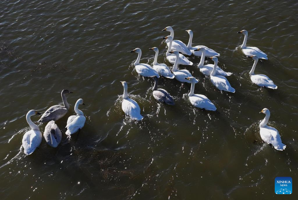 This aerial photo taken on Nov. 25, 2023 shows a flock of swans at a wetland in Fengnan District of Tangshan, north China's Hebei Province. Coastal wetlands in the city of Tangshan are important habitats for migratory birds. (Xinhua/Yang Shiyao)