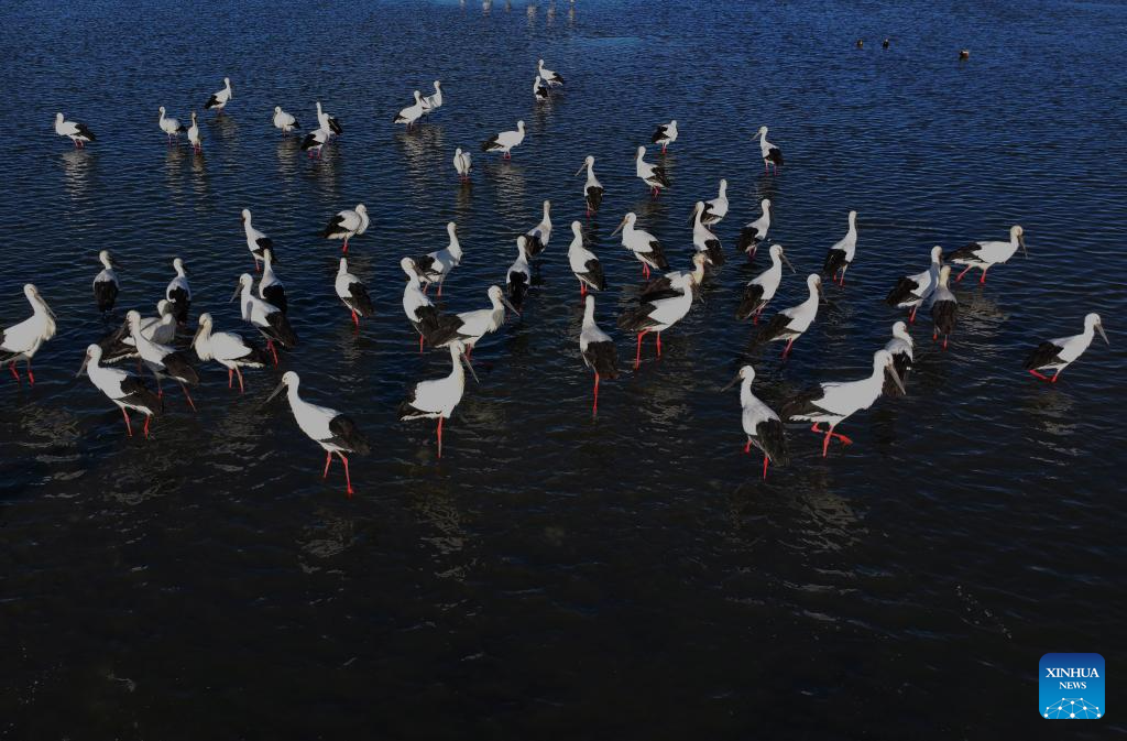 This aerial photo taken on Nov. 25, 2023 shows a flock of oriental white storks foraging at a wetland in Tangshan, north China's Hebei Province. Coastal wetlands in the city of Tangshan are important habitats for migratory birds. (Xinhua/Yang Shiyao)