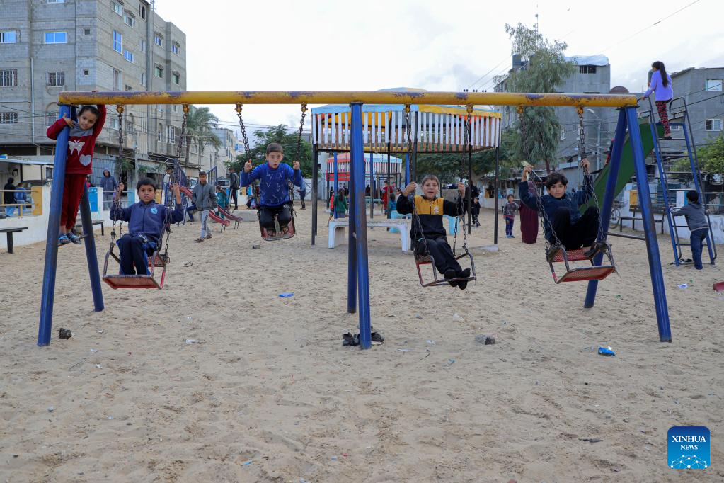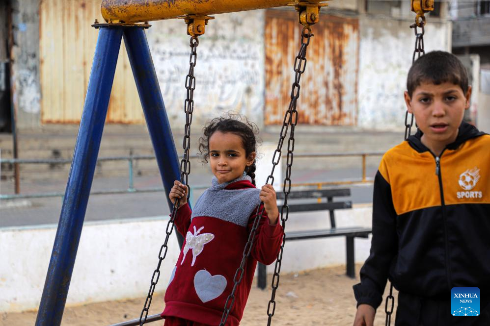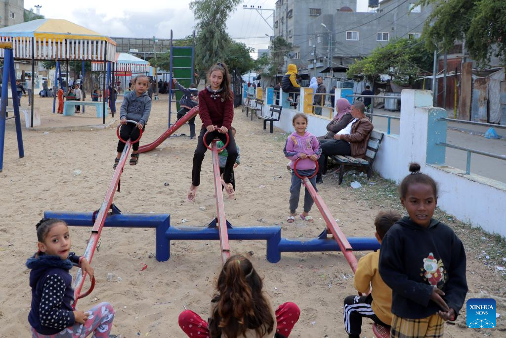 Children play at a playground in the southern Gaza Strip city of Rafah, on Nov. 27, 2023. Qatar announced on Monday that Israel and Hamas have agreed to extend the current humanitarian truce in the Gaza Strip for an additional two days. (Photo by Rizek Abdeljawad/Xinhua)