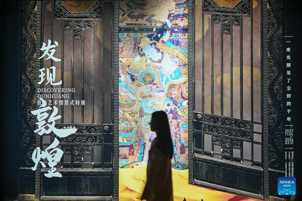 A visitor views exhibits at an exhibition themed on Dunhuang culture at the Tianjin Digital Art Museum in Tianjin, north China, Nov. 28, 2023. The exhibition will last until March 2024. (Xinhua/Sun Fanyue)