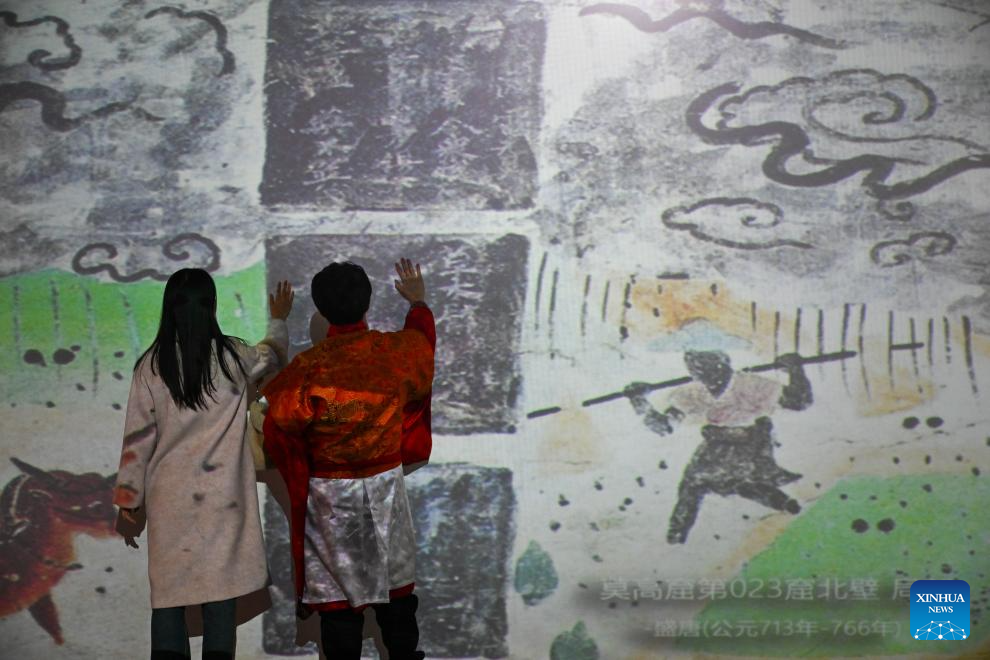 Visitors view exhibits at an exhibition themed on Dunhuang culture at the Tianjin Digital Art Museum in Tianjin, north China, Nov. 28, 2023. The exhibition will last until March 2024. (Xinhua/Sun Fanyue)