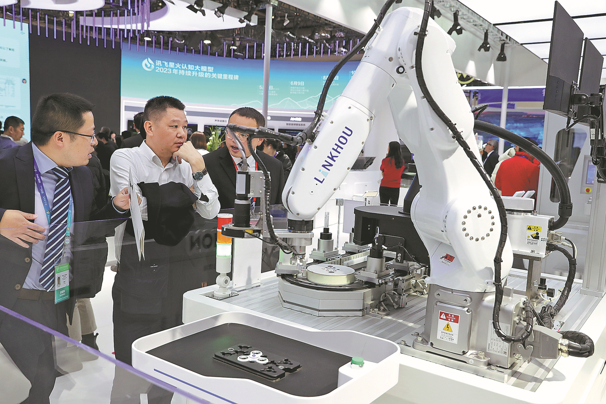 Visitors check a Linkhou multifunctional visual inspection platform on display at the China International Supply Chain Expo in Beijing on Tuesday. The machine provides an industrial camera to perform recognition, measurement and positioning tasks. WANG JING/CHINA DAILY