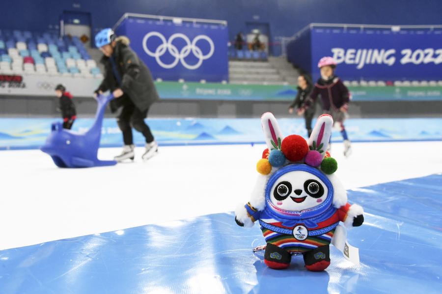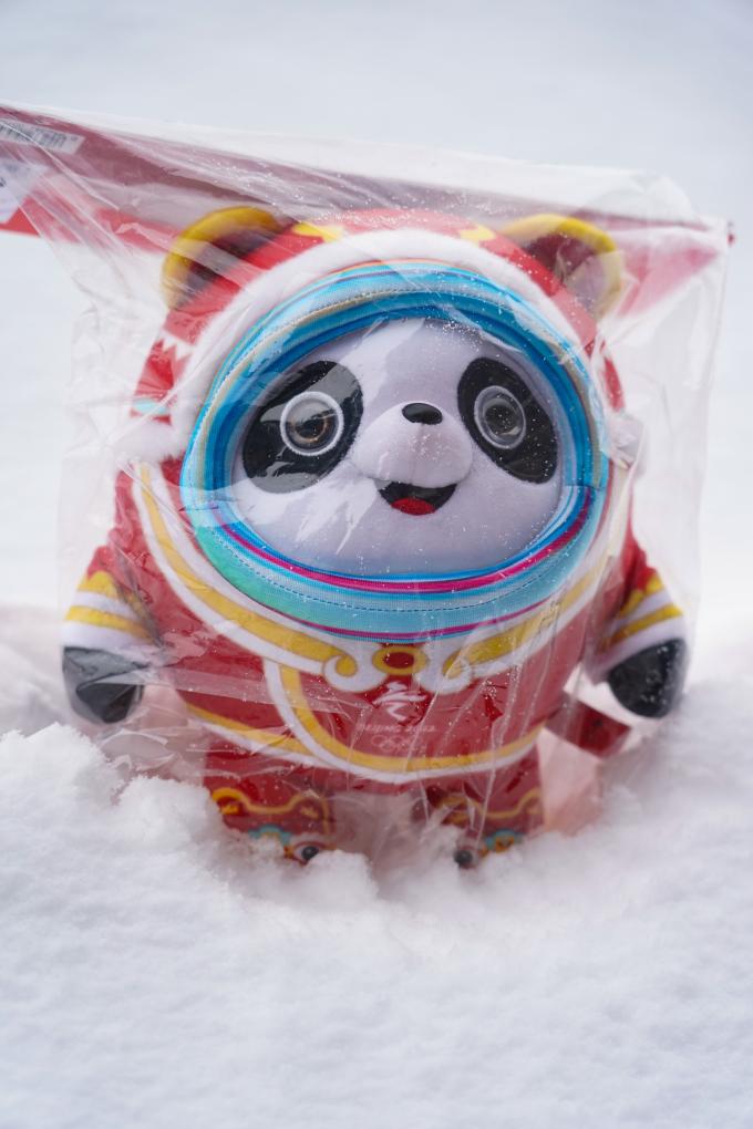 Photo taken on February 13, 2022 in Beijing shows the festival edition of Bing Dwen Dwen dressed in a costume with tiger boots to celebrate the Year of Tiger during the Beijing Olympic Winter Games. (Xinhua/Chen Zhonghao)