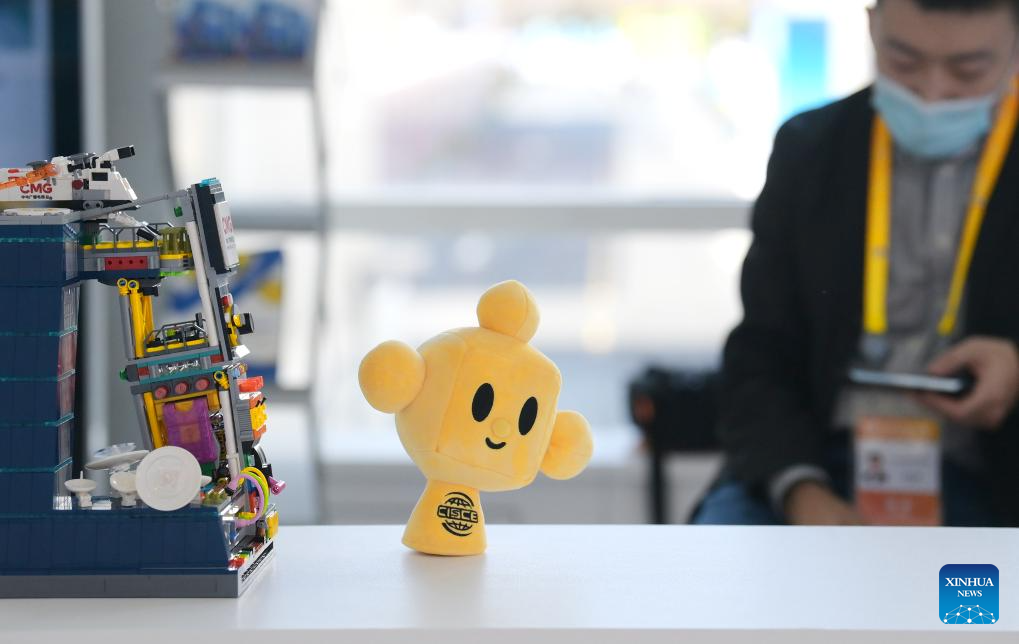 A mascot product of the China International Supply Chain Expo (CISCE) is seen at the expo held in Beijing, capital of China, Nov. 29, 2023. The CISCE opened in Beijing, the first of its kind in the world devoted to promoting industrial and supply chain collaboration. (Xinhua/Li He)