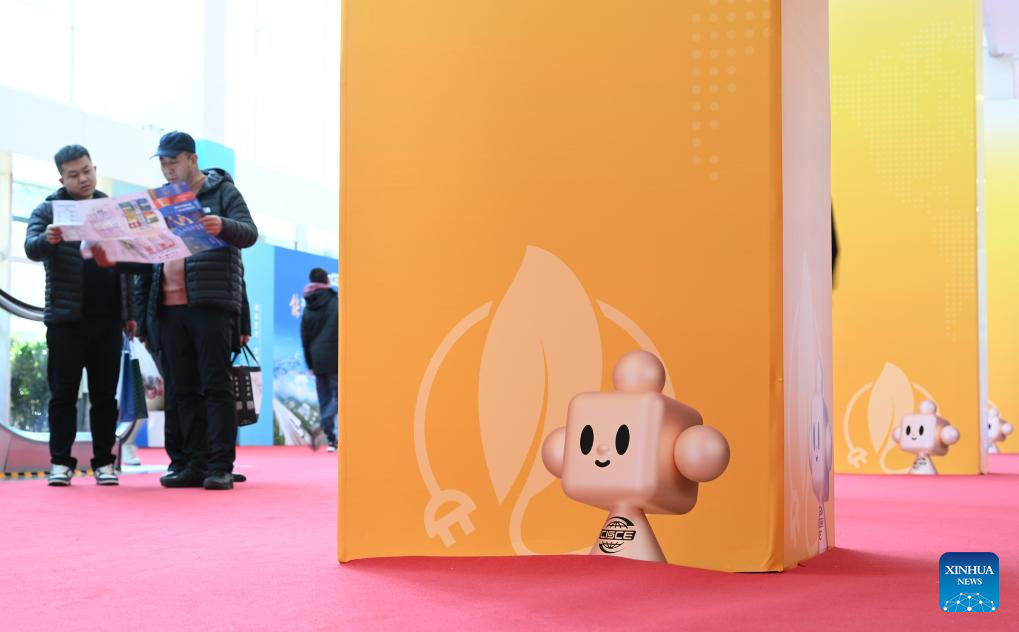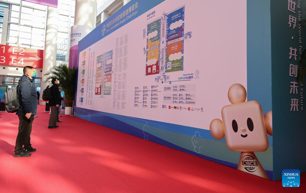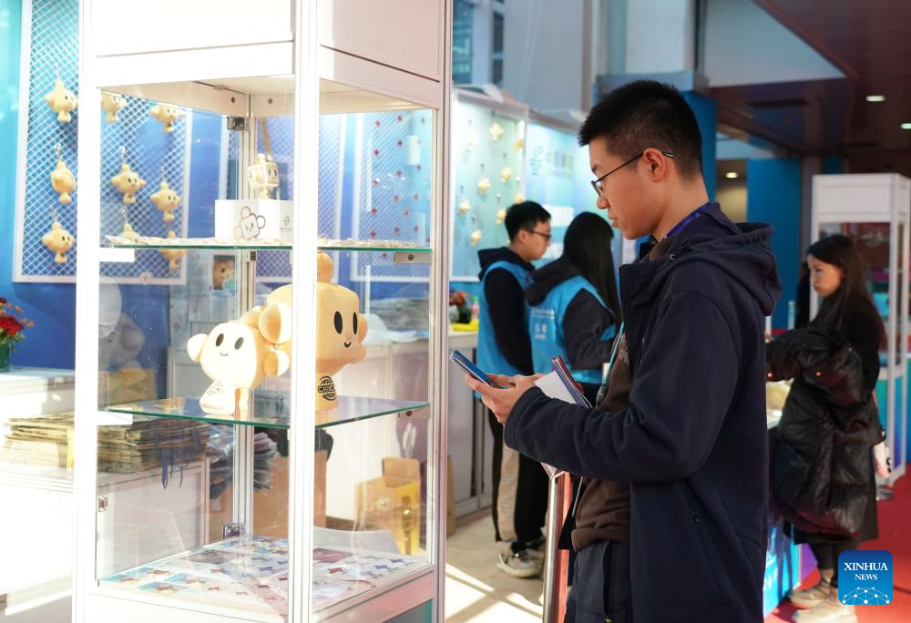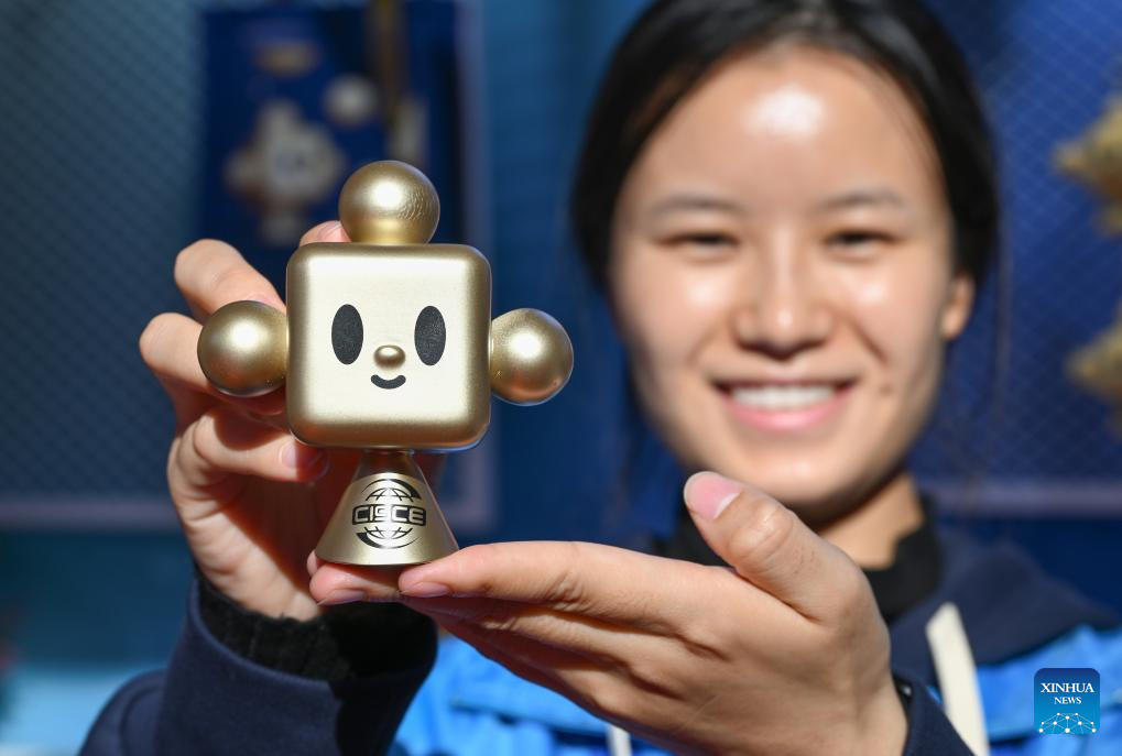 A visitor views mascot products of the China International Supply Chain Expo (CISCE) held in Beijing, capital of China, Nov. 29, 2023. The CISCE opened in Beijing, the first of its kind in the world devoted to promoting industrial and supply chain collaboration. (Xinhua/Ren Chao)