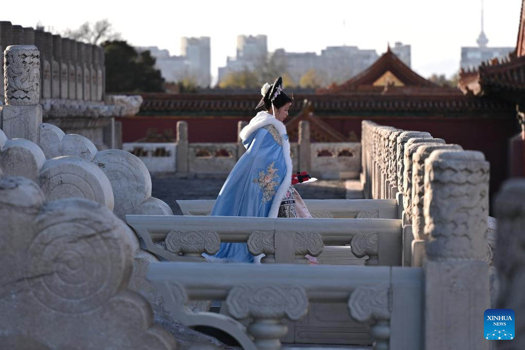 A girl takes photos at the Palace Museum, also known as the Forbidden City, in Beijing, capital of China, Nov. 29, 2023. (Xinhua/Chen Yehua)