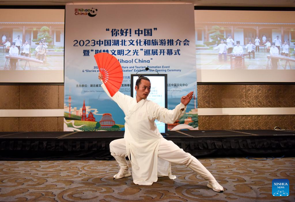 A performer demonstrates Taichi at the 2023 China-Hubei Culture and Tourism Promotion Event in Auckland, New Zealand, Nov. 30, 2023. China's Hubei Province promoted its unique culture and tourism on Thursday in Auckland, New Zealand's largest city. (Xinhua/Guo Lei)