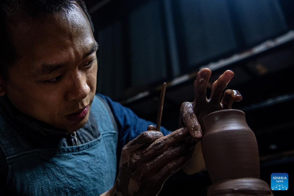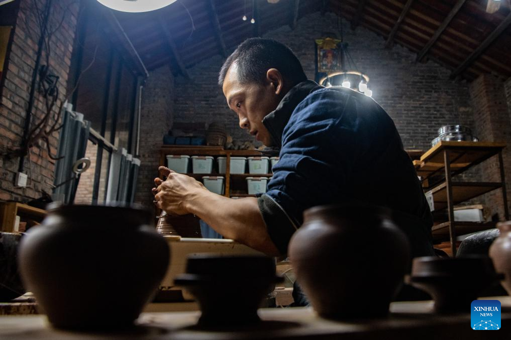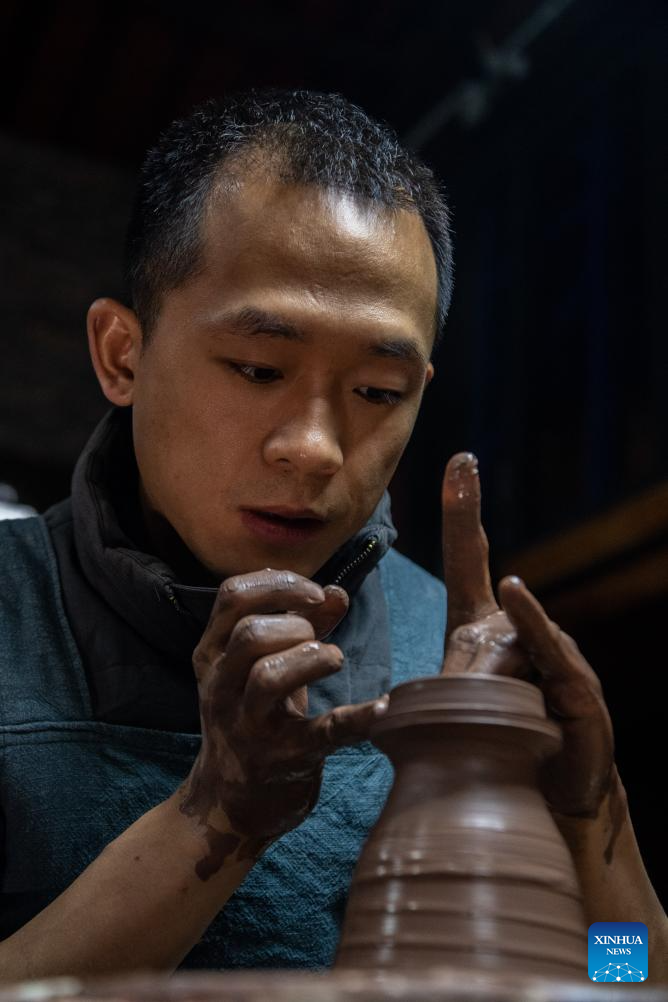 Guan Yongshuang makes a pottery artwork at his studio in Rongchang District of Chongqing, southwest China, Nov. 14, 2023. (Xinhua/Tang Yi)