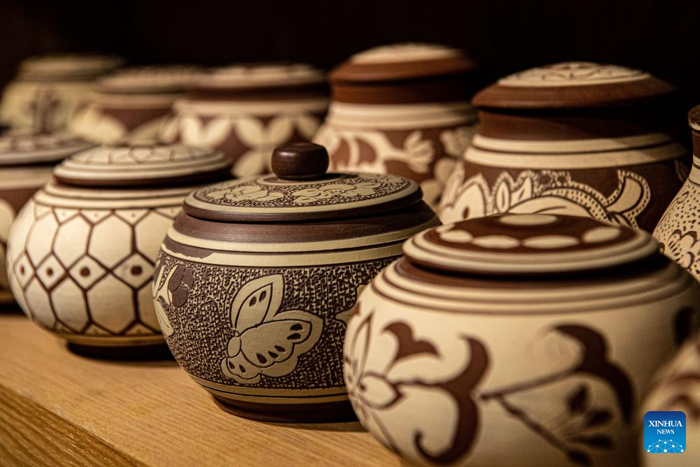 This photo taken on Nov. 14, 2023 shows pottery artworks displayed at Liang Xiancai's studio in Rongchang District of Chongqing, southwest China. (Xinhua/Tang Yi)