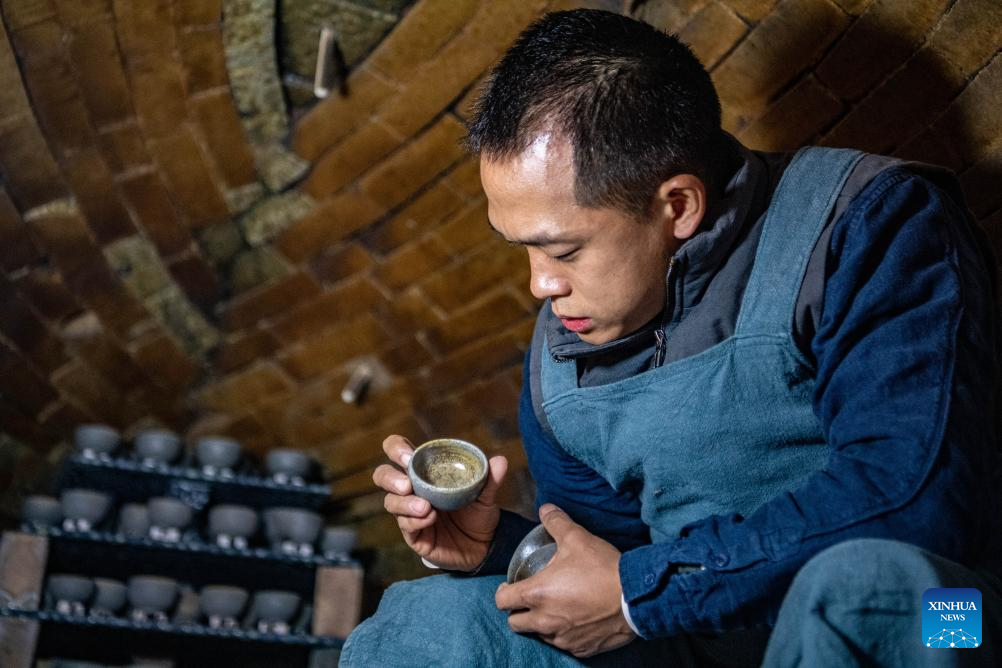 Guan Yongshuang checks the firing of pottery inside a kiln in Chongqing, southwest China, Nov. 14, 2023. (Xinhua/Tang Yi)
