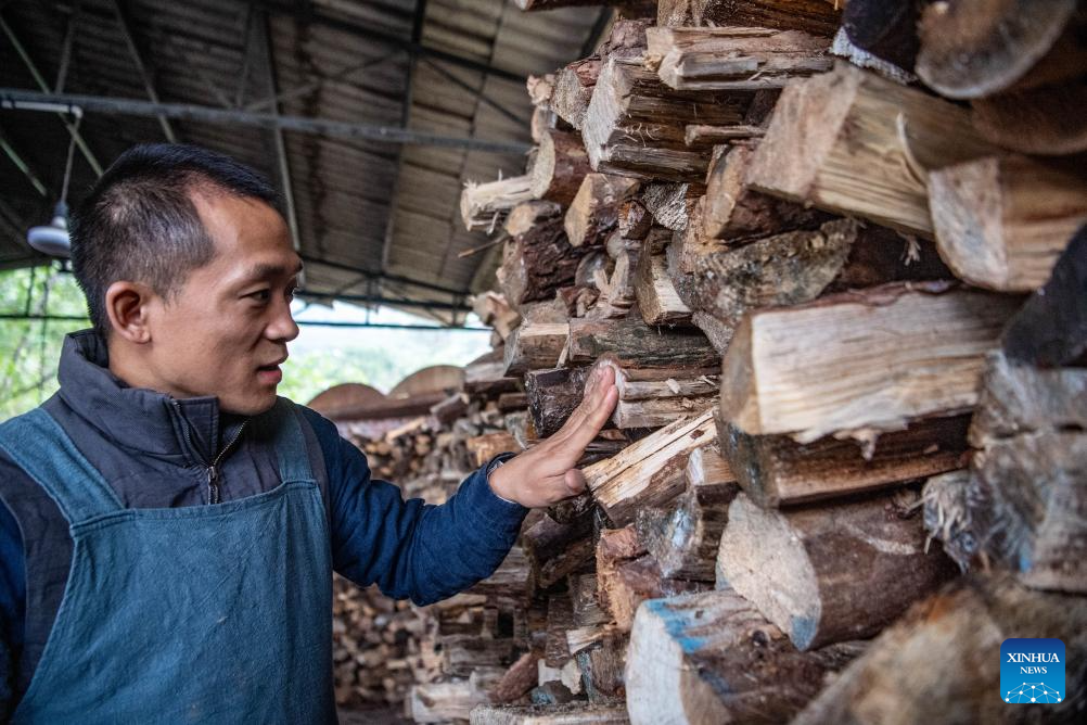 Guan Yongshuang checks woods for firing pottery at his studio in Rongchang District of Chongqing, southwest China, Nov. 14, 2023. (Xinhua/Tang Yi)