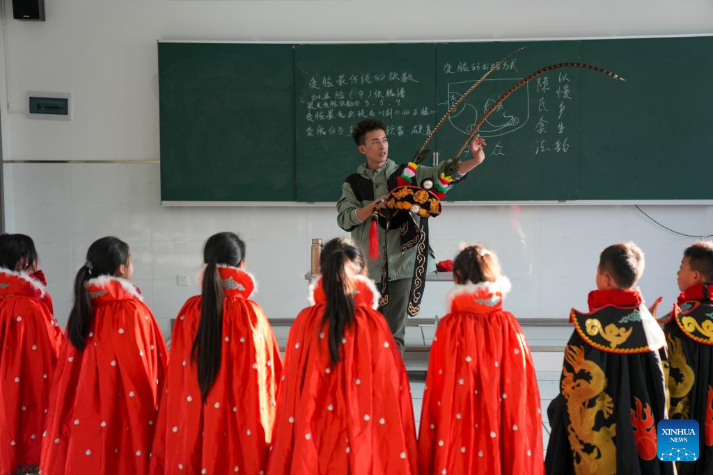 Folk artist Li Yong explains the decorations used in the traditional "bian lian" performance, or face-changing, at Wu'an primary school in Dianjiang County, southwest China's Chongqing, Nov. 28, 2023. With more than 600 students, Wu'an primary school in recent years cooperated with folk artist Li Yong and added face-changing as a special part to its curriculum. The face-changing technique is one of the most famous parts of Sichuan Opera, whereby actors rapidly alter their face makeup in stunning and dramatic effect. (Xinhua/Liu Chan)