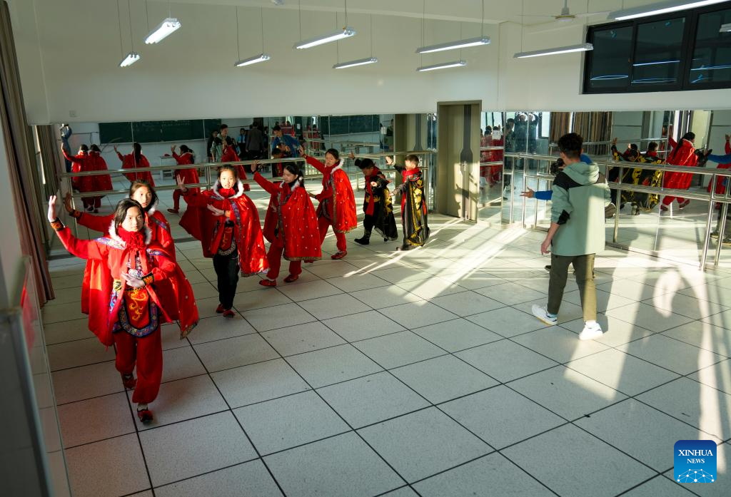 Students prepare to practice the traditional "bian lian", or face-changing skills, in a dance classroom at Wu'an primary school in Dianjiang County, southwest China's Chongqing, Nov. 28, 2023. With more than 600 students, Wu'an primary school in recent years cooperated with folk artist Li Yong and added face-changing as a special part to its curriculum. The face-changing technique is one of the most famous parts of Sichuan Opera, whereby actors rapidly alter their face makeup in stunning and dramatic effect. (Xinhua/Liu Chan)