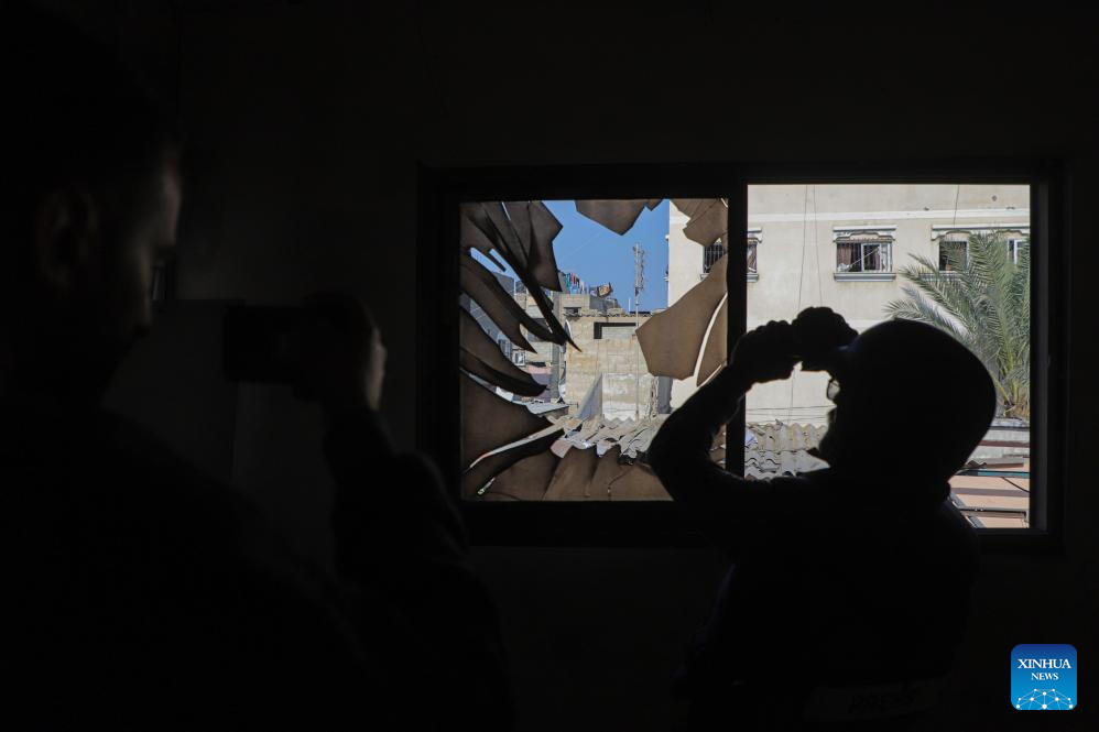 People inspect a building destroyed during Israeli air strikes in the southern Gaza Strip city of Khan Younis, Dec. 1, 2023. (Photo by Rizek Abdeljawad/Xinhua)
