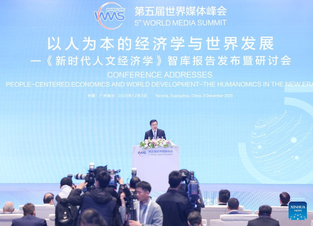 Fu Hua, president of Xinhua News Agency and chairman of the academic committee of New China Research (NCR), addresses the launch ceremony of a research report titled "The Humanomics in the New Era" during the ongoing 5th World Media Summit (WMS) in Guangzhou, capital of south China's Guangdong Province, Dec. 3, 2023. (Xinhua/Liu Bin)