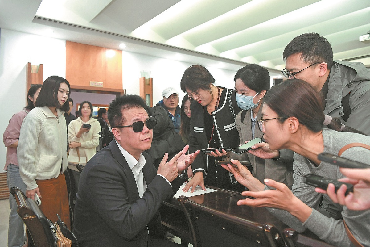 Wang Yongcheng (center), a deputy to the 14th National People's Congress, talks to reporters in Fuzhou, Fujian province, on Nov 13 after he received the Braille version of the replies to suggestions he raised early this year. CHINA DAILY