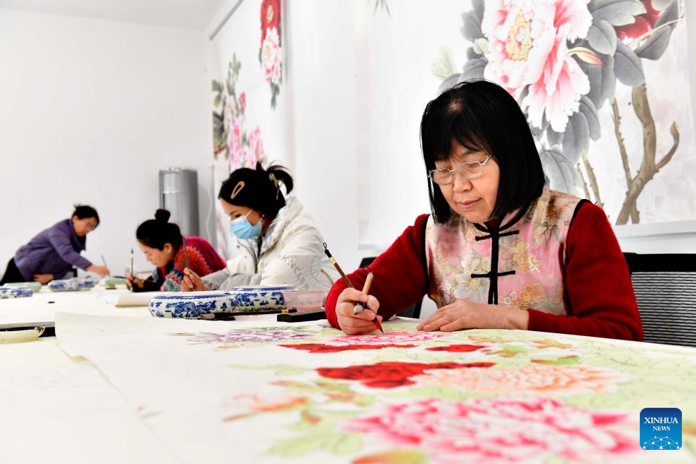 Farmers paint peony-themed realistic paintings at a studio in Juye County, Heze City of east China's Shandong Province, Dec. 2, 2023. (Xinhua/Guo Xulei)