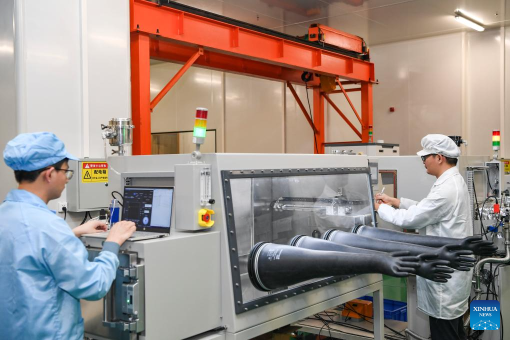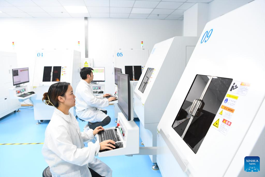 This photo taken on Nov. 30, 2023 shows a chip automation workshop of a technology company at a sensor industrial park in Chongqing, southwest China. In recent years, the Beibei District of Chongqing has worked together with China Railway Construction Corporation Limited (CRCC) in building a sensor industrial park. By introducing preferential policies, support funds and investment, the park is aimed at promoting the intelligent sensor industry to develop in a large-scale, specialized, differential and high-end way. (Xinhua/Wang Quanchao)
