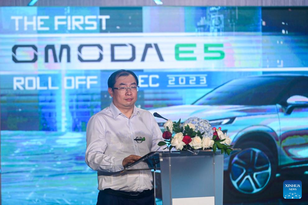 President of Chery International Zhang Guibin addresses the rolling off ceremony of Chery's electric vehicle model Omoda E5 in Bekasi, West Java, Indonesia, Dec. 2, 2023. The first electric vehicle (EV) of China's automotive company Chery has rolled off the production line in Indonesia, the company said on Saturday at its production base in Bekasi, a city east of the capital Jakarta. (Xinhua/Zulkarnain)