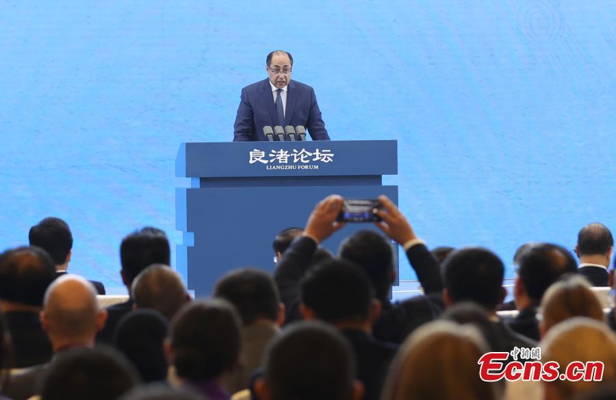 Hossam Zaki, assistant secretary-general of the Arab League speaks during the first Liangzhu Forum in Hangzhou, east China's Zhejiang Province, Dec. 3, 2023. (Photo: China News Service/Wang Gang)