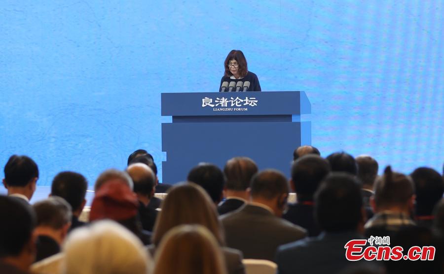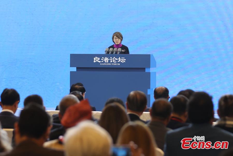 Stella Chryssoulaki, general director of Heraklion Archaeological Museum, speaks during the first Liangzhu Forum in Hangzhou, east China's Zhejiang Province, Dec. 3, 2023. (Photo: China News Service/Wang Gang)