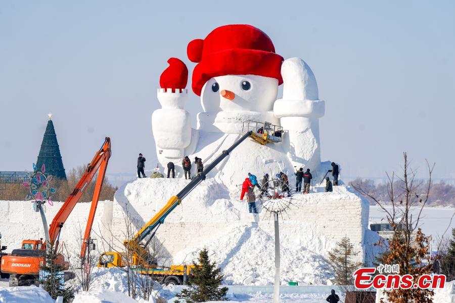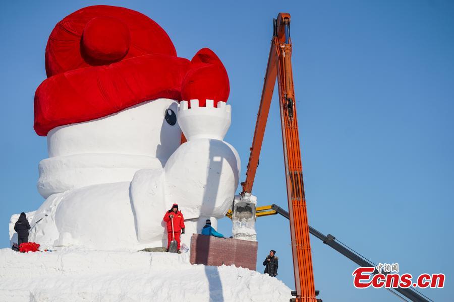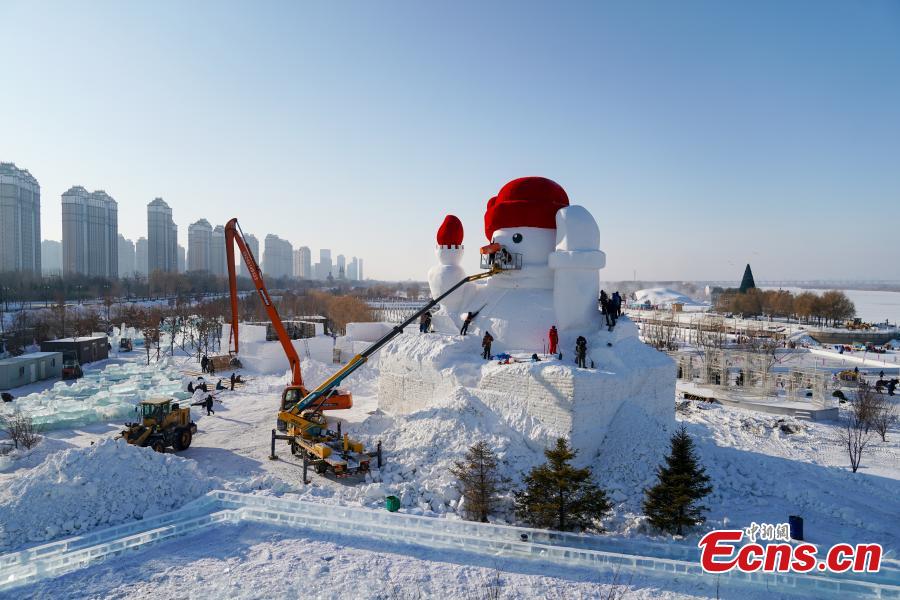 A landmark snowman is under construction in Harbin, northeast China's Heilongjiang Province, Dec. 3, 2023. (Photo: China News Service/Zhao Yuhang)