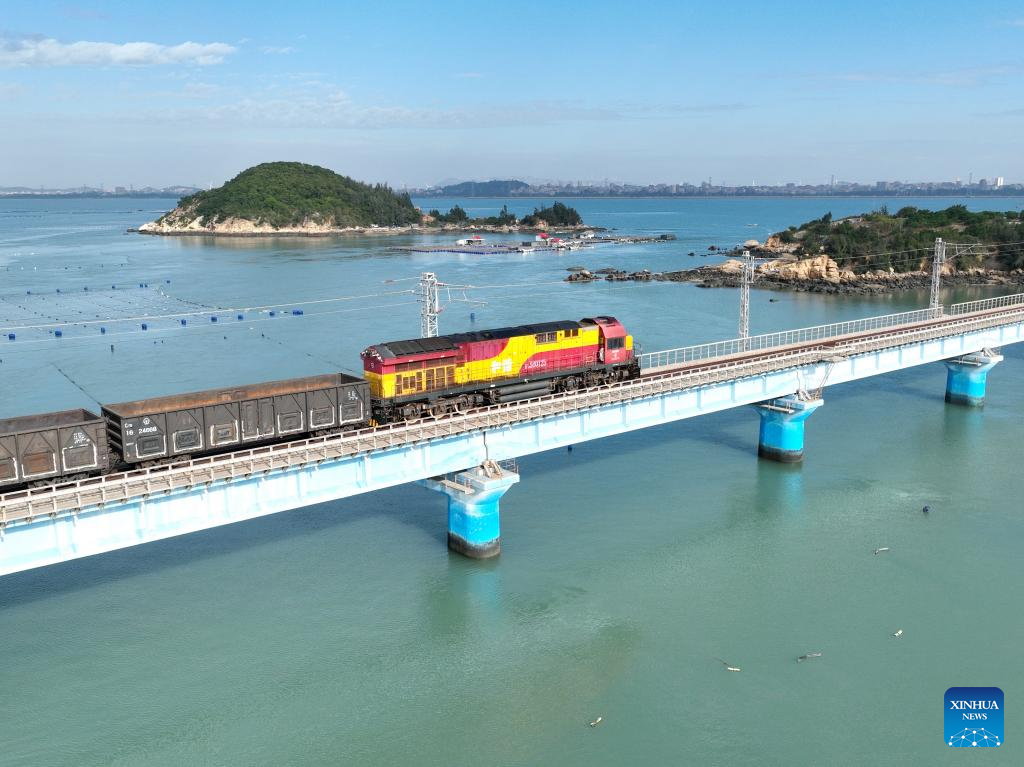 This aerial photo taken on Nov. 29, 2023 shows a sea-rail intermodal train transporting iron ore passing on a bridge near the Luoyu operating area in Meizhou Bay of Putian City, southeast China's Fujian Province. Ports constitute an important economic activity in coastal province Fujian, a core area in the construction of the 21st Century Maritime Silk Road. Fujian has seen improving ability in serving the Belt and Road (B&R) Initiative. (Xinhua/Lin Shanchuan)