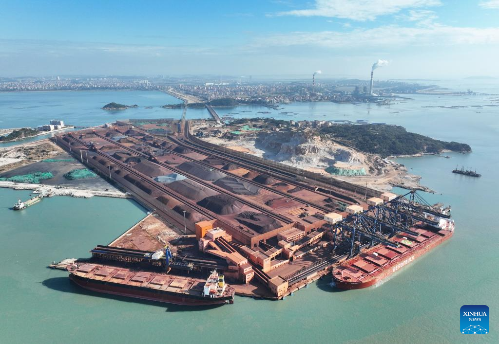 This aerial photo taken on Nov. 29, 2023 shows the Luoyu Port in Meizhou Bay of Putian City, southeast China's Fujian Province. Ports constitute an important economic activity in coastal province Fujian, a core area in the construction of the 21st Century Maritime Silk Road. Fujian has seen improving ability in serving the Belt and Road (B&R) Initiative. (Xinhua/Lin Shanchuan)