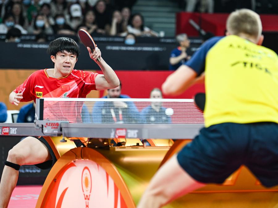 Wang Chuqin (L) hits a return during his men's singles win against Anton Kallberg. (Xinhua/Wang Xi)