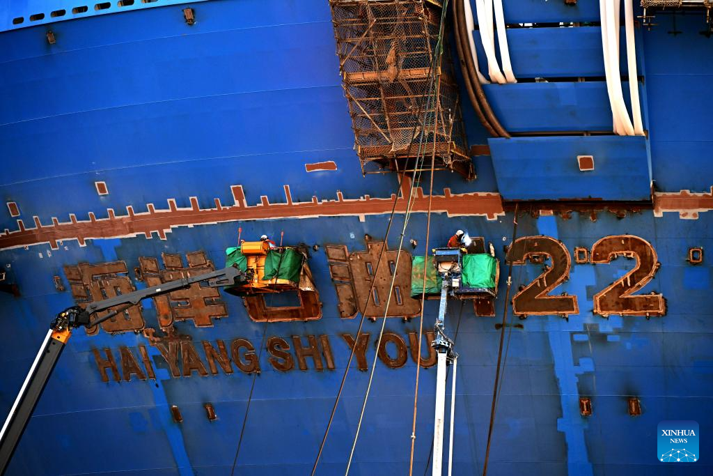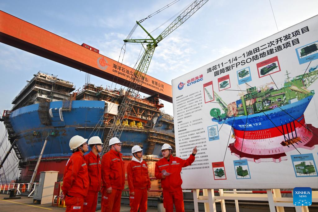 Workers are seen in the construction of Haiyang Shiyou 122, Asia's first cylindrical floating, production, storage, and offloading (FPSO) facility, in Qingdao, east China's Shandong Province, Dec. 4, 2023. Designed and manufactured in China, Haiyang Shiyou 122 has entered its final assembly phase recently in Qingdao. With a diameter of about 90 meters and designed displacement of 100,000 tonnes, the facility is capable of operating for 15 years at sea without returning to the dry dock. (Xinhua/Li Ziheng)