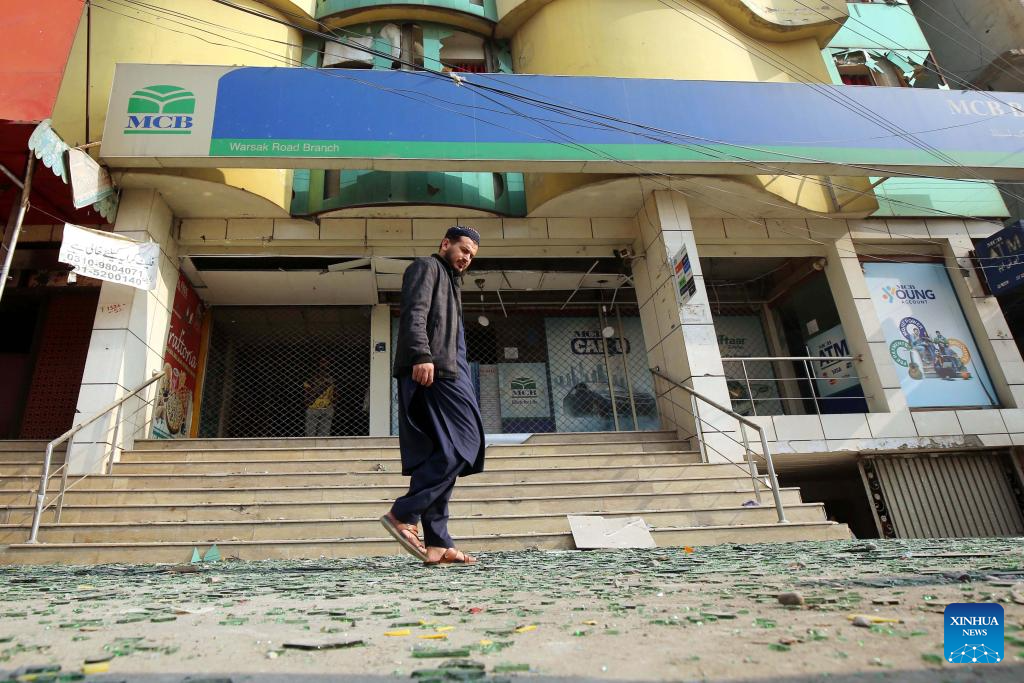 A man walks past a damaged building following a blast in Peshawar, Pakistan, Dec. 5, 2023. Seven people including four children were injured in a blast outside a school in Pakistan's northwest Khyber Pakhtunkhwa province on Tuesday, rescue teams said. (Photo by Umar Qayyum/Xinhua)