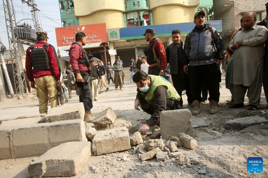 Security personnel examine the blast site in Peshawar, Pakistan, Dec. 5, 2023. Seven people including four children were injured in a blast outside a school in Pakistan's northwest Khyber Pakhtunkhwa province on Tuesday, rescue teams said. (Photo by Umar Qayyum/Xinhua)