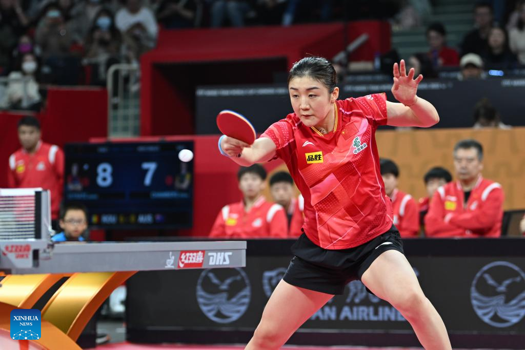 Chen Meng of China returns the ball during the stage 1 group 1 women's singles match against Zhu Chengzhu of China's Hong Kong at the ITTF Mixed Team World Cup 2023 in Chengdu, southwest China's Sichuan Province, Dec. 5, 2023. (Xinhua/Xu Bingjie)