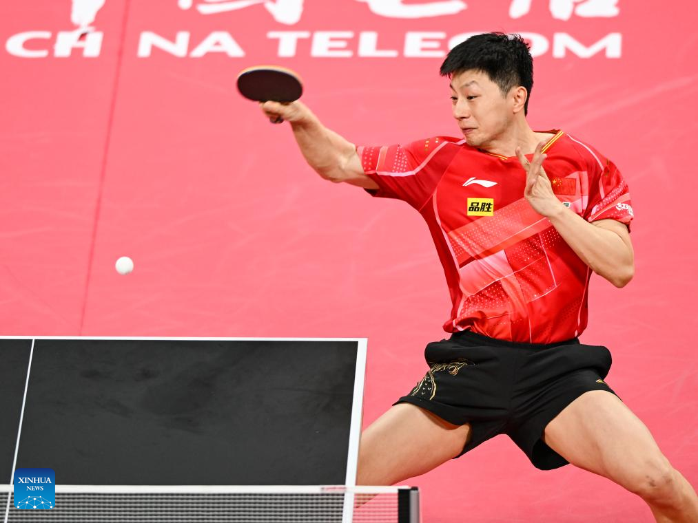 Ma Long of China competes during the stage 1 group 1 men's singles match against Angel Naranjo of Puerto Rico at the ITTF Mixed Team World Cup 2023 in Chengdu, southwest China's Sichuan Province, Dec. 5, 2023. (Xinhua/Wang Xi)