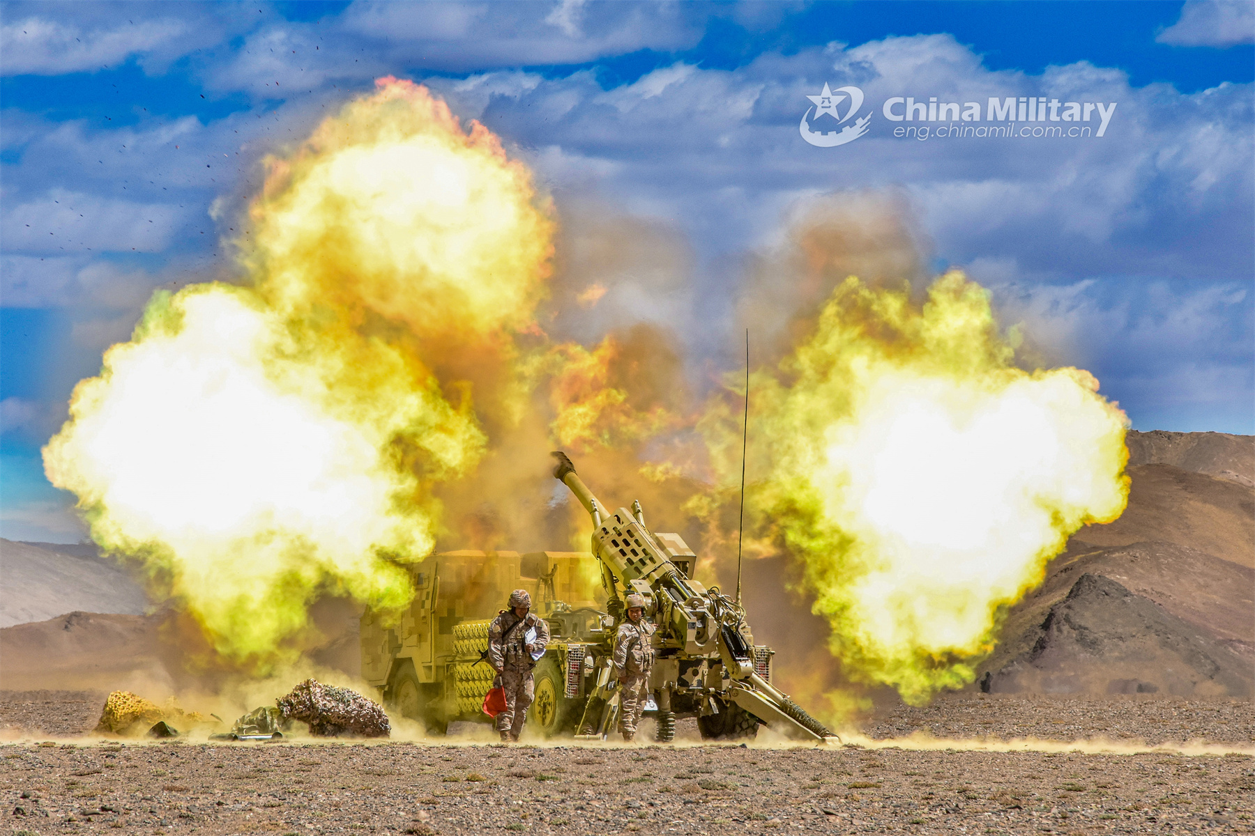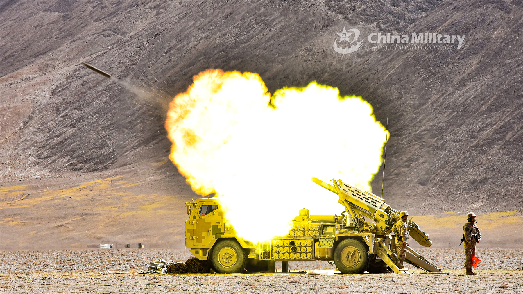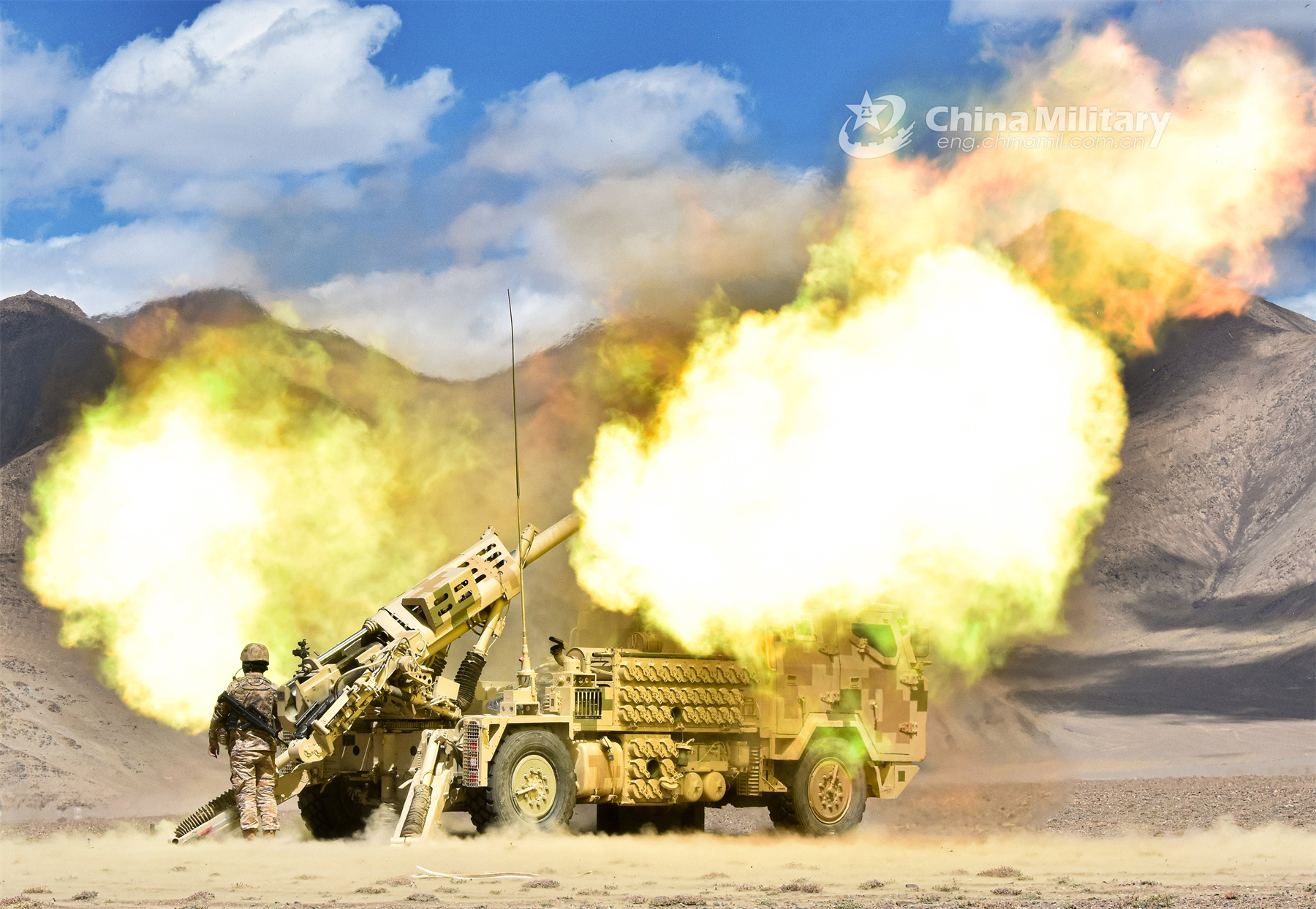 A vehicle-mounted howitzer attached to a combined-arms battalion with the army under the PLA Xinjiang Military Command fires at mock targets in a live-fire assessment in mid-November. (eng.chinamil.com.cn/Photo by Huang Di)