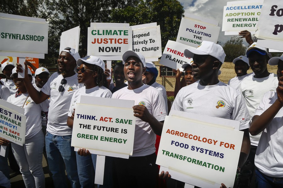 Climate activists display placards during a demonstration in Nakuru county, Kenya, on Nov. 14, 2023. (Photo by Sheikh Maina/Xinhua)