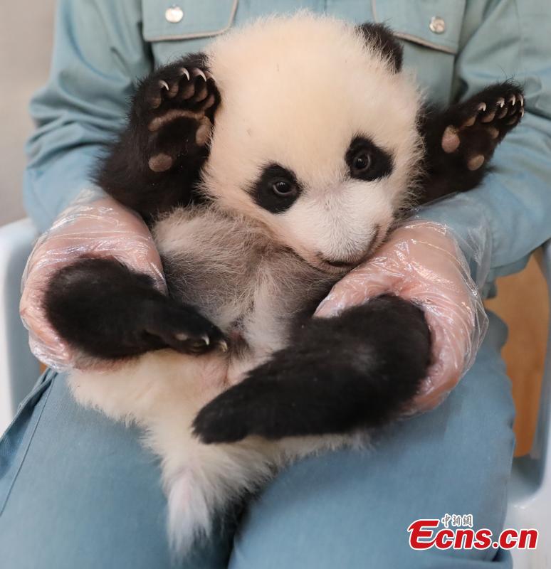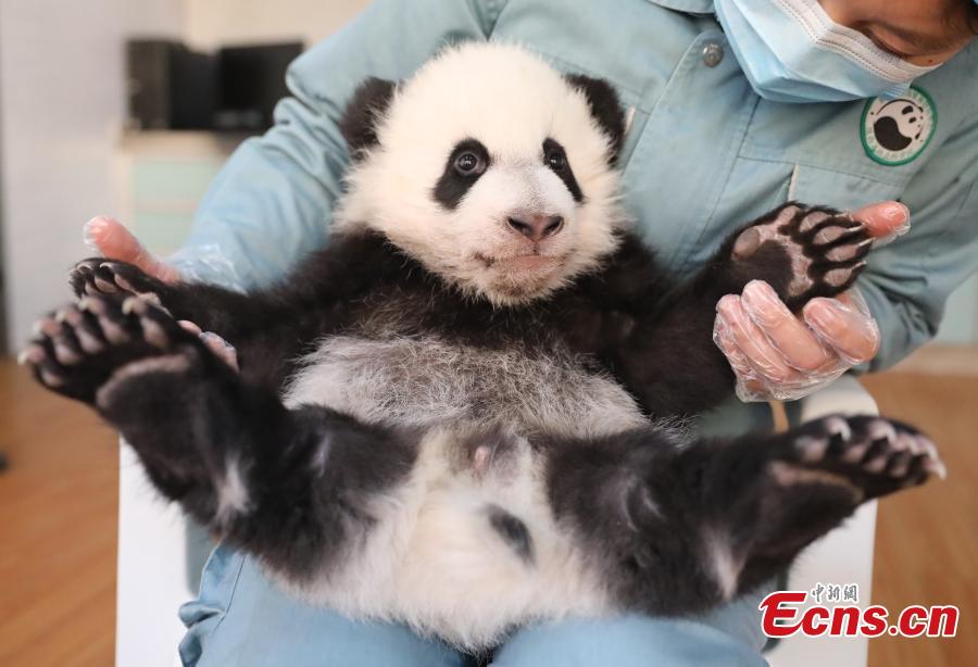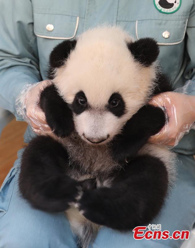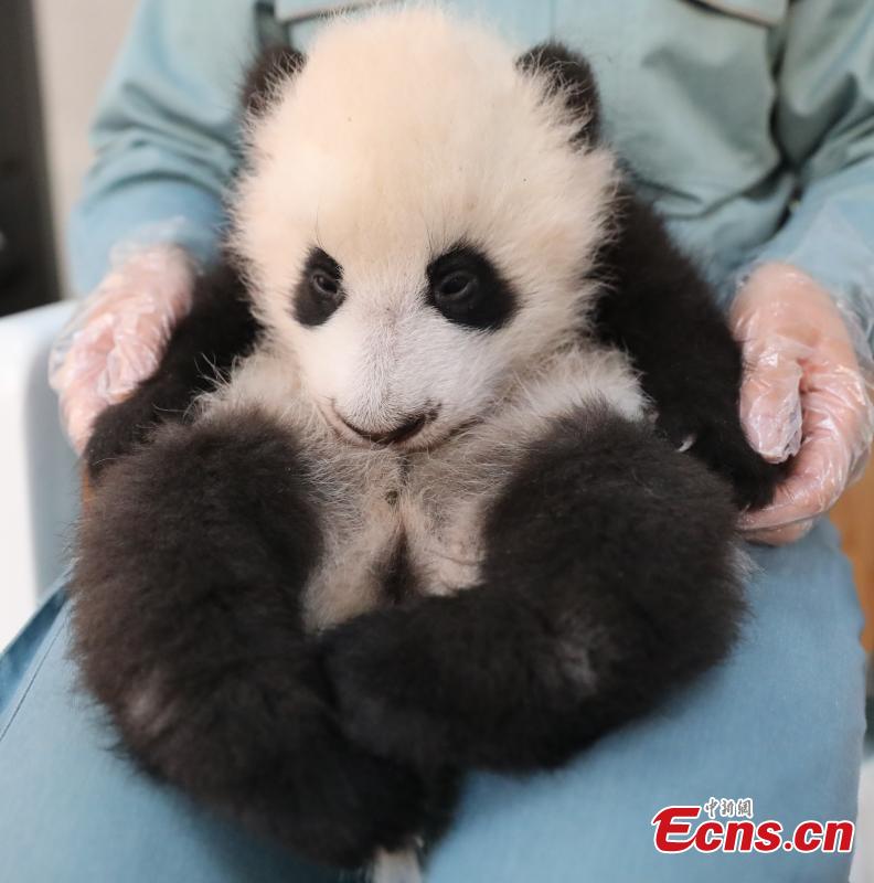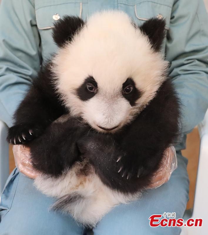 A staff member holds giant panda cub An An at the Research Center for Qinling Giant Panda, one of China's major giant panda breeding and research bases, in northwest China's Shaanxi Province, Dec. 5, 2023. (Photo: China News Service/Xu Guanglan)
