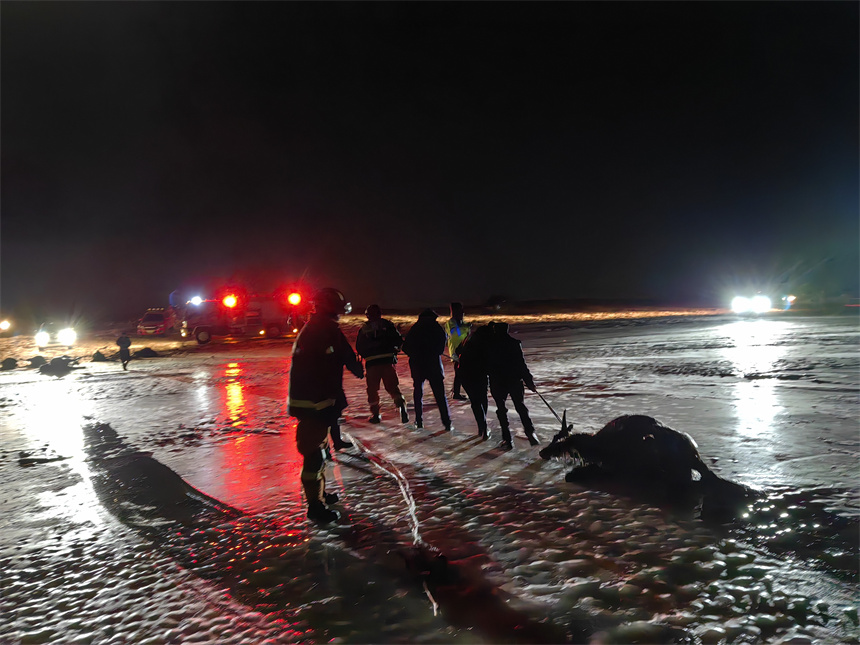 Rescuing the yaks was no easy task. Madoi, which means "the source of Yellow River" in Tibetan, is one of the highest counties in the country, with an average altitude of 4,300 meters. In late November, temperatures in the county dropped to minus 20 degrees Celsius, freezing the lake water solid.