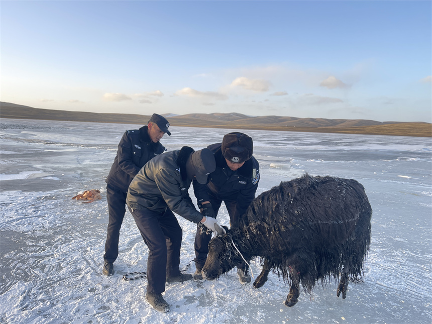 Police officers and residents in Madoi county, northwest China's Qinghai Province, recently rescued nine yaks stranded in a frozen lake.