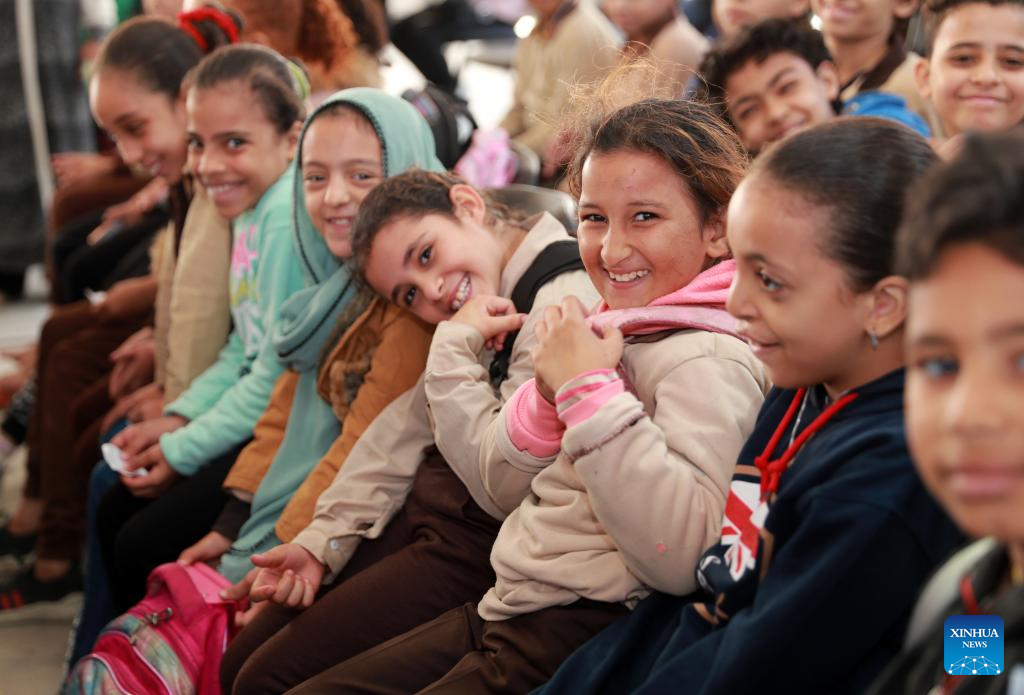 Students attend a donation ceremony held at the Al-Asmarat District's service center in the Cairo Governorate, Egypt, Dec. 5, 2023. The Chinese Embassy in Egypt, in cooperation with the pro-government Egyptian political party of Homat Al Watan (the Protectors of the Nation), has donated school materials to students in need in Cairo. (Xinhua/Sui Xiankai)