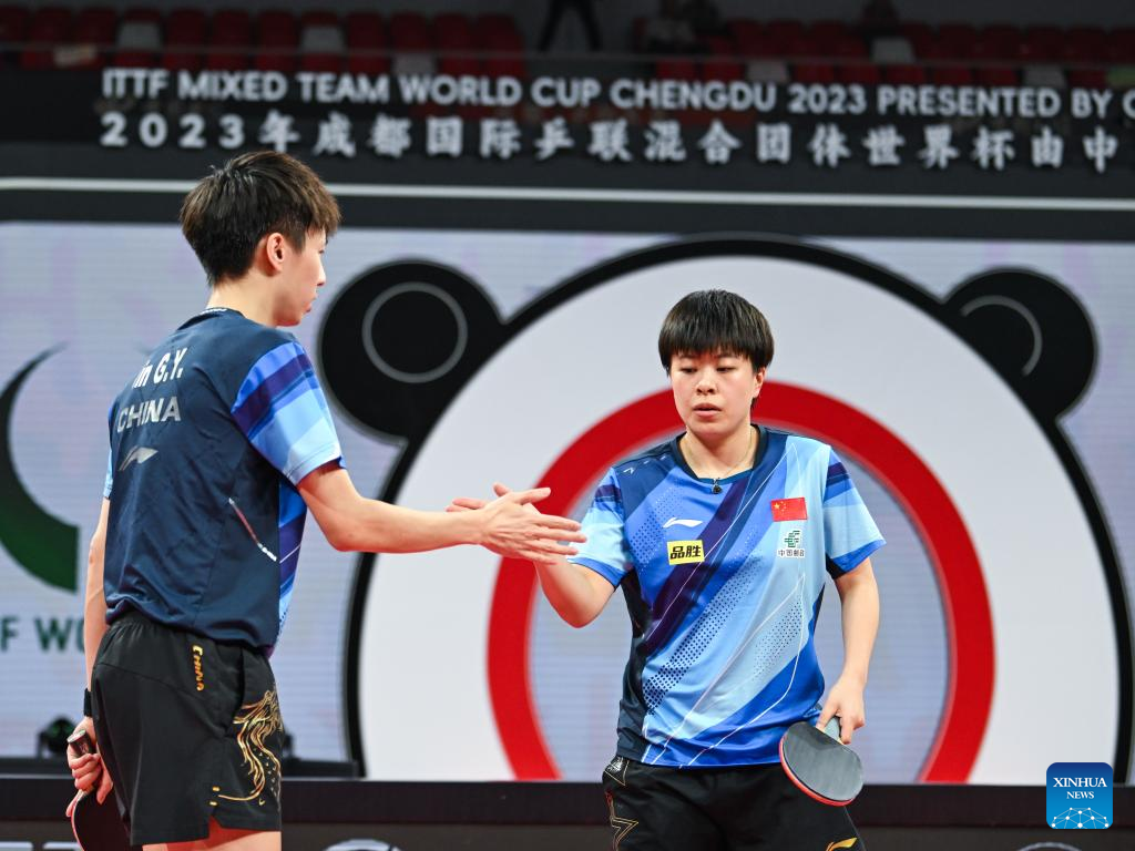 Lin Gaoyuan/Wang Yidi (R) of China react during the stage 2 mixed doubles match against Jakub Zelinka/Tatiana Kukulkova of Slovakia at the ITTF Mixed Team World Cup 2023 in Chengdu, southwest China's Sichuan Province, Dec. 6, 2023. (Xinhua/Wang Xi)