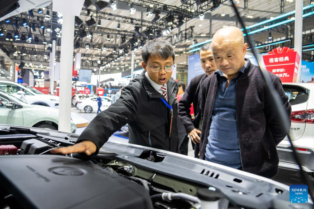 People visit an automobile exposition at the Changsha International Convention and Exhibition Center in Changsha, central China's Hunan Province, Dec. 6, 2023. The 19th China (Changsha) International Automobile Exposition opened here on Wednesday, which gathers products from more than 80 automobile-related brands in an exhibition area of 100,000 square meters. (Xinhua/Chen Sihan)