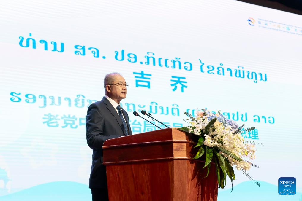 Lao Deputy Prime Minister Kikeo Khaykhamphithoune delivers a speech at the second Belt and Road Forum for Laos-China Cooperation in Vientiane, Laos, Dec. 7, 2023. The second Belt and Road Forum for Laos-China Cooperation kicked off here Thursday to discuss the implementation of the outcomes of the meeting between the top leaders of the two parties and the two countries, and the building of the China-Laos community with a shared future. (Xinhua/Zhu Wei)