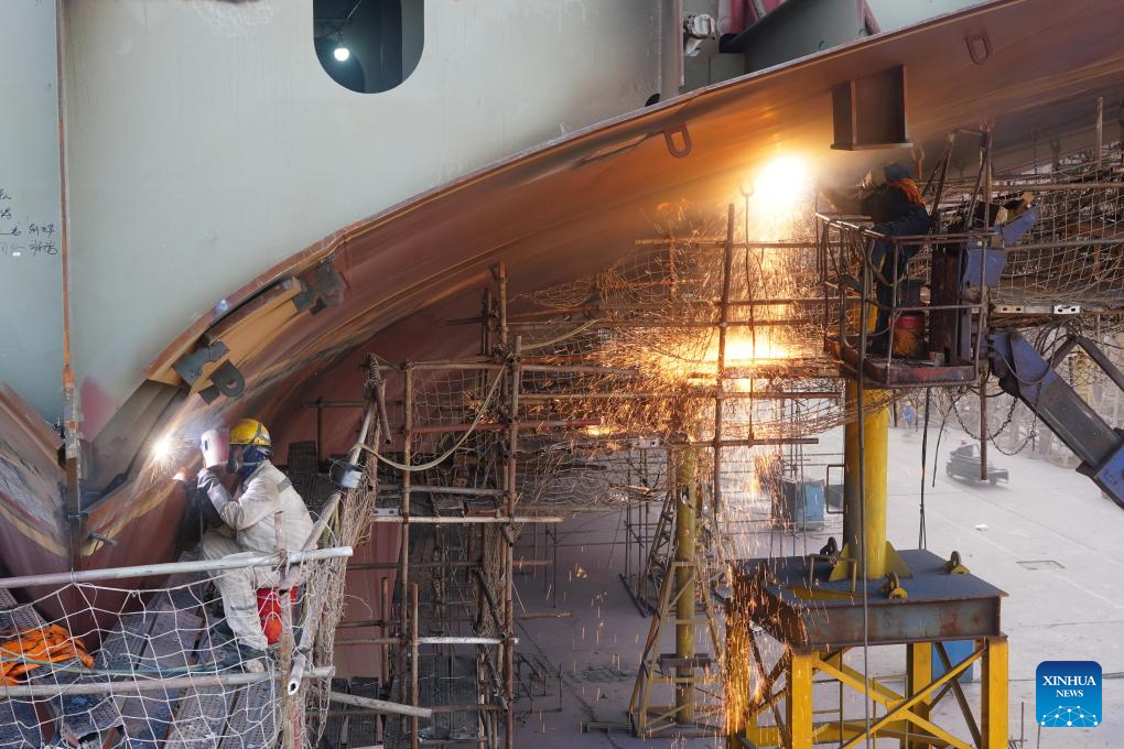 Workers work at a shipyard of Jiangsu Yangzi Xinfu Shipbuilding Co., Ltd. in Taixing, east China's Jiangsu Province, Dec. 5, 2023.