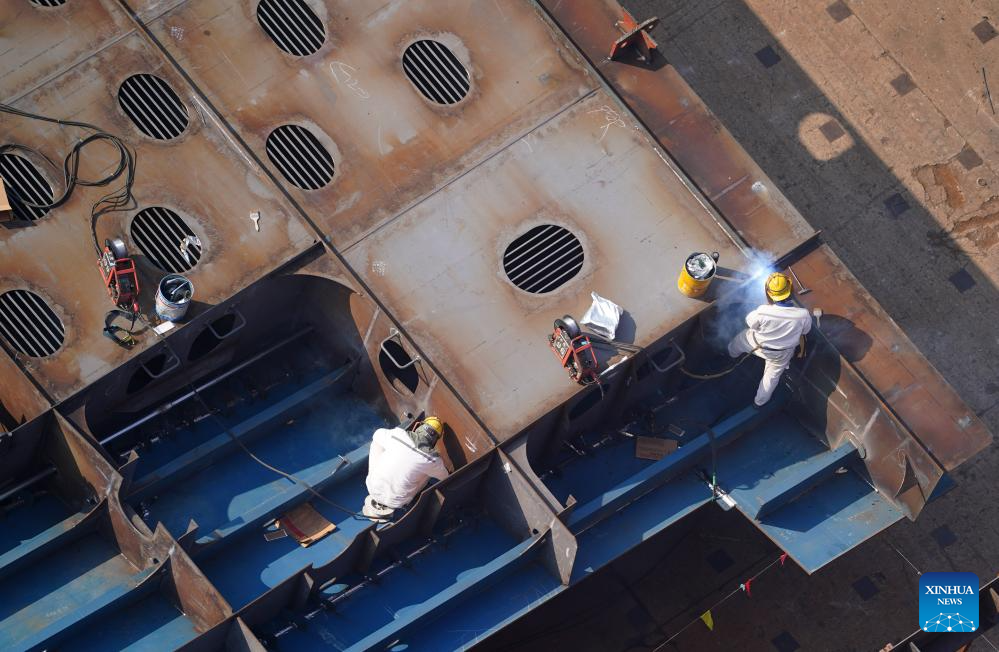Workers work on components of a container vessel at a shipyard of Jiangsu Yangzi Xinfu Shipbuilding Co., Ltd. in Taixing, east China's Jiangsu Province, Dec. 5, 2023.