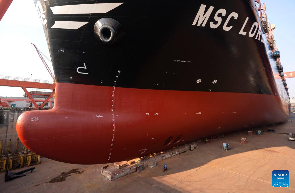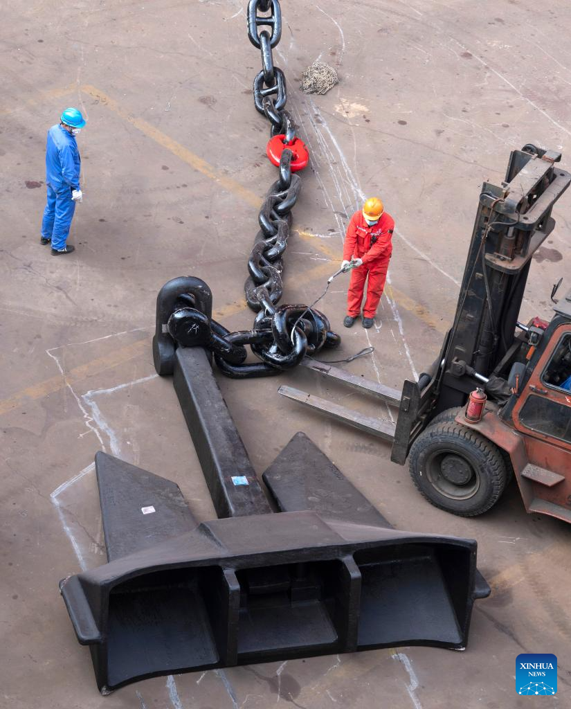 Workers install an anchor to a container vessel at a shipyard of Jiangsu Yangzi Xinfu Shipbuilding Co., Ltd. in Taixing, east China's Jiangsu Province, Dec. 5, 2023.