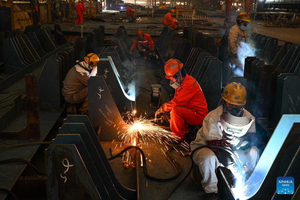 Workers weld in a workshop of Jiangsu Yangzi Xinfu Shipbuilding Co., Ltd. in Taixing, east China's Jiangsu Province, Dec. 5, 2023.