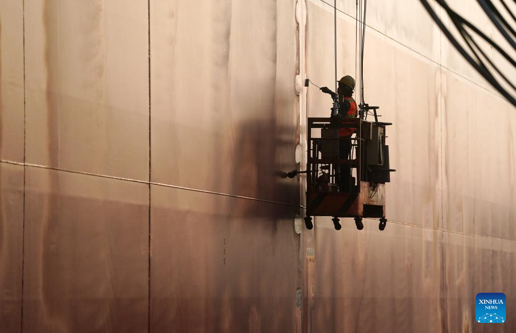 A worker paints a container vessel at a shipyard of Jiangsu Yangzi Xinfu Shipbuilding Co., Ltd. in Taixing, east China's Jiangsu Province, Dec. 5, 2023.