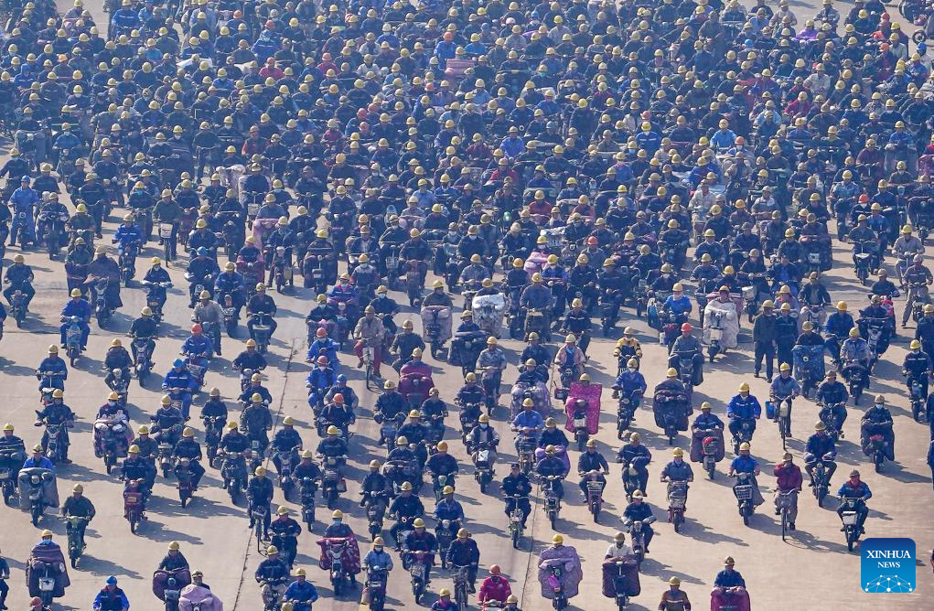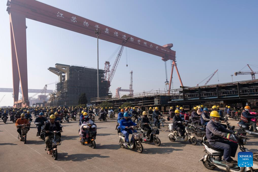 This aerial photo taken on Dec. 5, 2023 shows workers riding to leave a shipyard of Jiangsu Yangzi Xinfu Shipbuilding Co., Ltd. in Taixing, east China's Jiangsu Province.